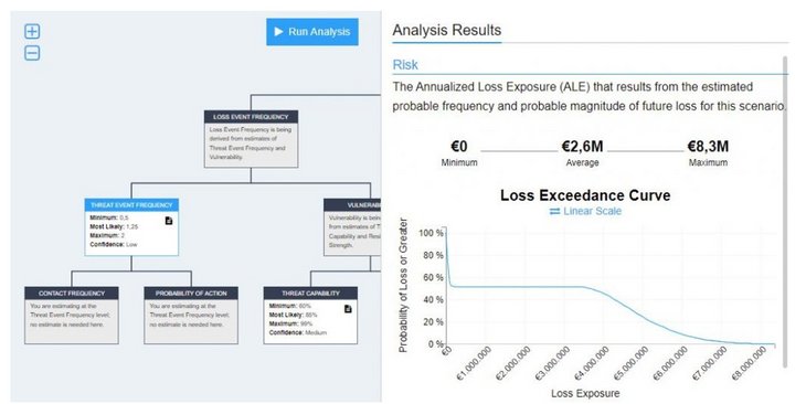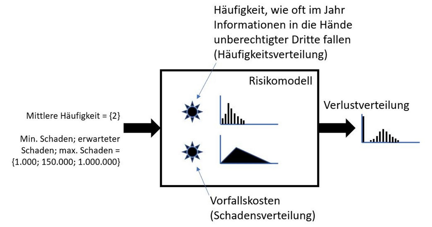 In diesem Beispiel hat ein Experte abgeschätzt, dass im Jahresdurchschnitt (Erwartungswert) mit zwei Vorfällen gerechnet werden kann (es können allerdings auch mehr oder weniger Vorfälle auftreten) und dass der Schaden zwischen 1.000 (bester Fall) und 1 Mio. EUR (schlimmster Fall) liegen wird, mit einem erwarteten Schaden von 150.000 EUR (realistischer Fall). Das Risikomodell bildet nun aus einer Häufigkeits- und Schadensabschätzung für den Informationsabfluss an unberechtigte Dritte ein Risiko, welches in Form einer Verlustverteilung am Ende der Berechnung als Ergebnis ausgegeben wird. Der Risikomanager kann anhand der Verlustverteilung nun wichtige Aussagen treffen wie "der mittlere erwartete Schaden beträgt x Euro", "ich bin zu 90% sicher, dass der Schaden x Euro nicht übersteigt" und "in einem von 100 Fällen wir der Schaden x Euro übersteigen".