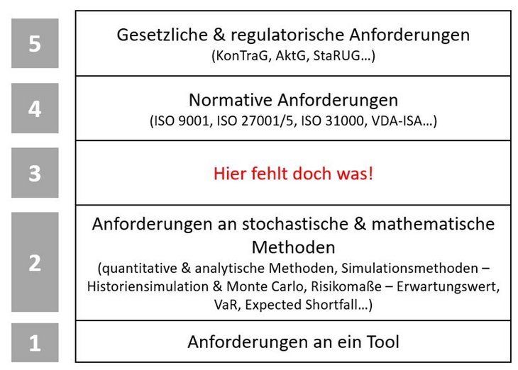 Doch wie werden die Risiken berechnet? Diese Fragestellung auf Ebene 3 bezeichne ich als die Anforderungen an die Risikoanalyse.