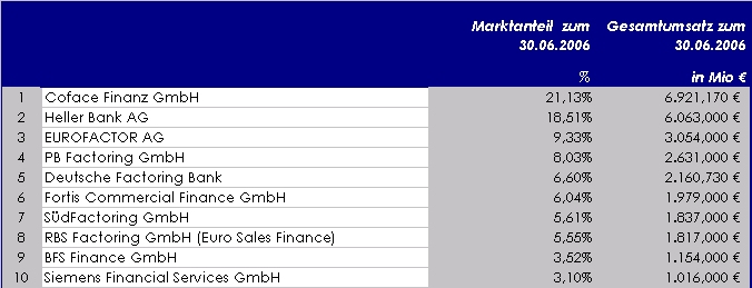 Der deutsche Markt für den Verkauf von Forderungen aus Lieferungen oder Dienstleistungen wird von der Coface Finanz GmbH mit einem Marktanteil von 21,13 Prozent dominiert. Die Coface Finanz ist als Tochtergesellschaft der Coface Kreditversicherung AG auf Factoring spezialisiert. Dabei kauft das Factoringinstitut (Factor) von seinen Factoringkunden Geldforderungen im Rahmen eines Vertrages an. Vor Vertragsabschluß und fortlaufend prüft der Factor die Bonität der Abnehmer und übernimmt im Rahmen eines vereinbarten Limits das volle Ausfallrisiko. Wird der Abnehmer des Factoring-Kunden zahlungsunfähig, springt der Factor im Rahmen der vertraglich vereinbarten Limite ein.Der Factorkunde informiert seine Abnehmer darüber, dass die Forderungen an den Factor verkauft wurden und der Rechnungsbetrag an diesen zu zahlen ist (siehe Grafik) und stellt dem Factor laufend Rechnungskopien über die Forderungen zur Verfügung bzw. übermittelt die Rechnungsdaten durch Datenfernübertragung. Sofern die Rechnungsbeträge im Rahmen der eingeräumten Limite liegen, kauft der Factor die Forderungen an.