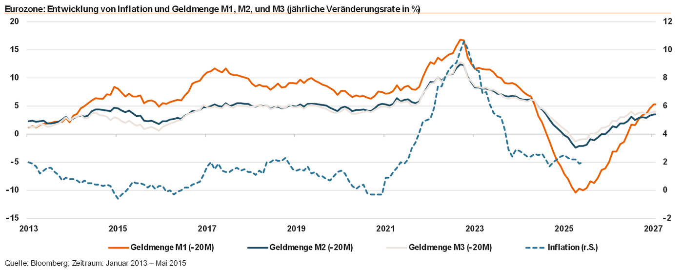 Hier wirken aber kurzfristige Dynamiken. Keinesfalls besteht Anlass, dauerhaft Entwarnung zu geben für mögliche Inflationsrisiken. Volkswirtschaftlich wichtige Indikatoren für nachfolgende Inflationsentwicklungen sind die Geldmengenaggregate. Auch deren Verhalten zeigt nach vorne gerichtet durchaus, dass neuer Inflationsdruck im Entstehen ist. Typischerweise folgen Verbraucherpreiseanstiege mit ein bis zwei Jahren Verzögerung auf die Schöpfung monetärer Inflation. Aktuell weiten sich Kreditvergaben und Geldschöpfung in der Eurozone wieder aus – grundsätzlich ein positives Signal für eine anspringende Gesamtwirtschaft. Gelangt diese neu geschaffene Liquidität mit dem Geldkreislauf in Umlauf, steigen mit Zeitverzug die Preise für Güter und Dienstleistungen. Befördert wird diese Entwicklung stets durch eine (zu) lockere Geld- und/oder Fiskalpolitik.