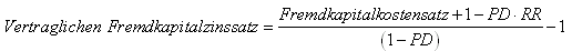 Nehmen wir an, bei dem spezifischen Risikoprofil einer Investition I in ein neues Unternehmen leitet der Eigenkapitalgeber (mit welchem Modell auch immer, beispielsweise CAPM) eine risikogerechte Anforderung an die Eigenkapitalrendite von 6 Prozent ab (Opportunitätskostenkalkül). Er berechnet nun, ob das Projekt für ihn eine erwartete Rendite erbringt, die höher als der Eigenkapitalkostensatz (6 Prozent) liegt. Die Investition hat eine äußerst einfache Zahlungscharakteristik: Für einen Kapitaleinsatz (in t = 0) von 1 erhält er mit 90-%iger Wahrscheinlichkeit einen Rückfluss von 1,2 (in t = 1) und mit 10-%iger Wahrscheinlichkeit (PD) einen Rückfluss von 0 (Insolvenz). Die Investition soll zu 50 Prozent fremdfinanziert werden, d. h. die Fremdkapitalgeber stellen FK = 0,5 zur Verfügung und das eingesetzte Eigenkapital beträgt EK=0,5. Die Fremdkapitalgeber erwarten eine Rendite von 4 Prozent, dies entspricht dem Fremdkapitalkostensatz, der damit offensichtlich niedriger als der Eigenkapitalkostensatz ist (4 Prozent < 6 Prozent). Um im Mittel 4 Prozent Rendite ("expected return“) zu erhalten, müssen die Fremdkapitalgeber vertraglich einen Fremdkapitalzinssatz von 15,56 Prozent vereinbaren ("promised yield“), da in 10 Prozent aller Fälle keine Rückzahlung erfolgt (Hinweis: Die Betrachtung ändert sich auch nicht grundlegend, wenn Sicherheiten der Fremdkapitalgeber berücksichtigt werden). In diesem Fall berechnet sich der vertragliche Fremdkapitalzinssatz in Abhängigkeit der erwarteten Fremdkapitalkosten (kFK) und der Recovery Rate (RR) wie folgt:![]()