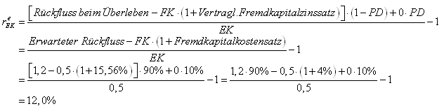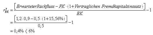 Würde man die Investitionsrechnung mit dem Fremdkapitalzinssatz (d. h. unter Vernachlässigung der Insolvenz) durchführen, käme man zu folgender – falscher – Berechnung der erwartenden Eigenkapitalrendite (reEK)