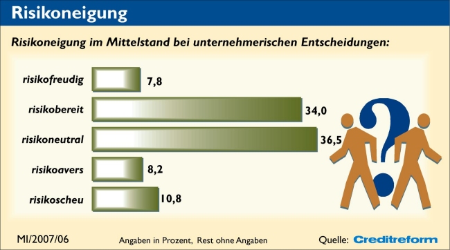 Creditreform befragte knapp 4.000 Unternehmen, wie sie sich selbst beurteilen und von welchen Faktoren ihre Risikobereitschaft abhängt. Immerhin bezeichnet sich mehr als ein Drittel der Befragten als risikobereit (34,0 Prozent). Die Mehrheit der Unternehmer (36,5 Prozent) hält sich allerdings für risikoneutral. Nach eigenen Angaben risikofreudig sind nur 7,8 Prozent der Befragten, aber gut jeder zehnte Unternehmer (10,8 Prozent) sieht sich selbst als geradezu risikoscheu (Tab.1).