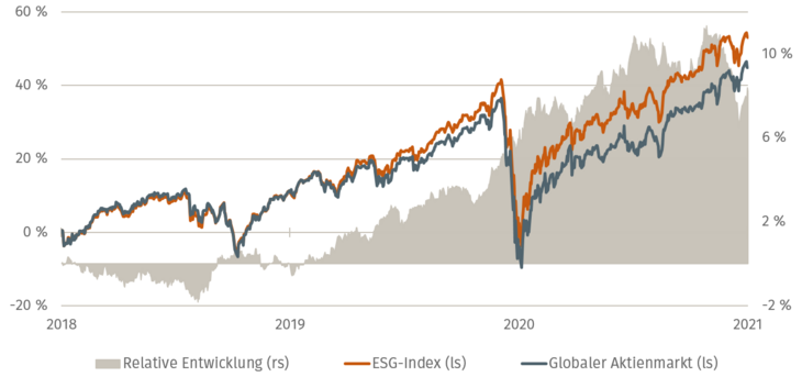 Abb. 01: Wertentwicklung (in EUR) ESG-Index vs. globaler Aktienmarkt [Quelle: Assenagon, Bloomberg; Stand: März 2021]