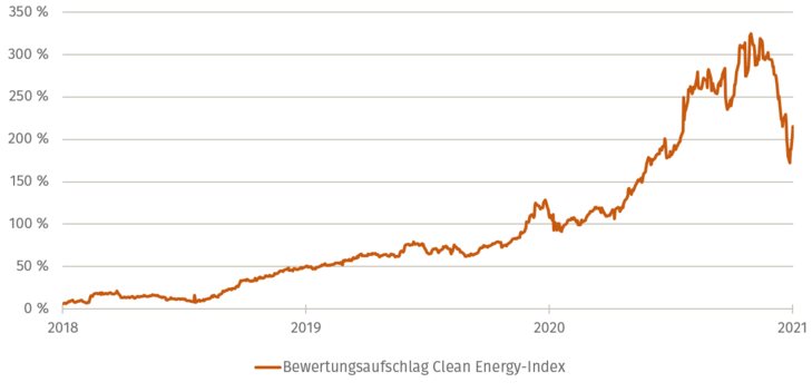 Abb. 02 vergleicht das Bewertungsniveau des globalen Clean Energy-Index in Relation zum globalen Value-Index – gemessen am Kurs-Buchwert-Verhältnis. Es lässt sich beobachten, dass das Thema Clean Energy relativ zum Value-Index vor wenigen Jahren nicht einmal teuer bewertet wurde. Allerdings haben sich die Bewertungen der Indizes in den vergangenen drei Jahren signifikant entkoppelt – in der Spitze betrug der Bewertungsaufschlag gut 320 Prozent. Dass dies eine Übertreibung darstellte, verdeutlicht die rasante Korrektur im ersten Quartal 2021.