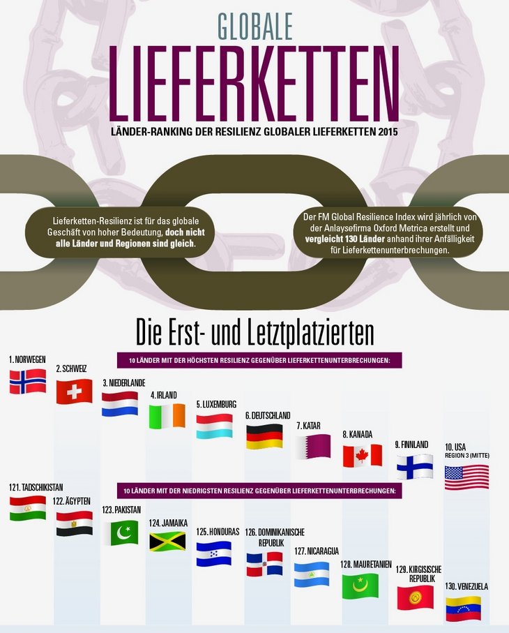 Der FM Global Resilience Index bietet diesbezüglich eine erste Orientierung. Es ist das erste interaktive Online-Tool seiner Art, das 130 Länder anhand ihrer Anfälligkeit für Lieferkettenunterbrechungen vergleicht und damit Entscheidern als Hilfsmittel und Diskussionsgrundlage für die Konzeption und Planung ihrer globalen Lieferkette dient. Für den Index werden neun Treiber, die sich auf die Resilienz von Lieferketten auswirken, zu drei Faktoren zusammengefasst: Wirtschaft, Risikoqualität und die Lieferkette selbst.
