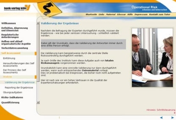 Das Management operationeller Risiken ist aber nicht nur Chefsache; es beginnt bereits auf der untersten hierarchischen Ebene. Der Integrierte Fernlehrgang „Operational Risk“ des Bank-Verlags ermöglicht Mitarbeitern den Aufbau der hierfür erforderlichen Kompetenz. Die Kombination aus schriftlichem Lehrgang und E-Learning-Modul enthält das erforderliche Wissen, um operationelle Risiken zu erkennen, zu reduzieren und zu beherrschen, sorgt für leichtes Lernen durch die Kombination verschiedener Medien (Blended Learning), bietet den Nutzern direkten Kontakt zu Autoren und Herausgebern und deren lernbegleitende Unterstützung und ermöglicht ein ortsunabhängiges Lernen, vermeidet damit fortbildungsbedingte betriebliche Fehlzeiten und bietet darüber hinaus ein Nachschlagewerk für die arbeitstägliche Bankpraxis.