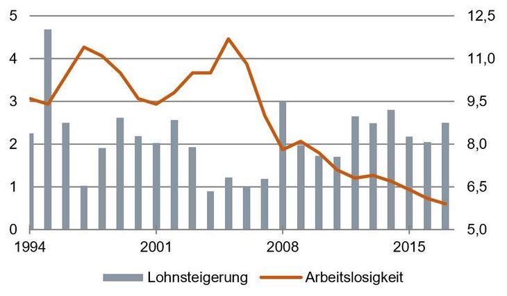Wie ist das zu erklären? Als erstes denkt man natürlich an die abnehmende Zahl der Gewerkschaftsmitglieder. Sie verringert die Verhandlungsmacht der Arbeitnehmer. Das ist aber nicht überzeugend. Denn auch schon vor der Finanzkrise waren immer weniger Menschen bereit, sich in Gewerkschaften zu organisieren. Auch die Flüchtlingskrise kann hier keine Rolle spielen. Denn erst seit 2015 gibt es so viele Immigranten.