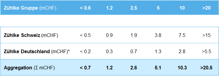 Abb. 01: Bei der Aggregation der Risiken werden die Bewertungsskalen im Schadensausmaß der Einzelgesellschaften addiert. Die Summe ergibt ähnliche Werte wie die Bewertungsskala der Unternehmensführung. Dadurch werden die aggregierten Werte mit denen der Group vergleichbar (*Die €-Werte der Zühlke Deutschland wurden mit einem Währungskurs EUR/CHF = 1.10 in CHF ungerechnet.).