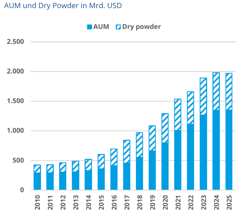 Das weltweite Wachstum des Private-Debt-Marktes hat die Assetklasse professionalisiert. AUM (Assets under Management, also das von Fonds bzw. Asset Managern verwaltete Anlagevermögen) und Dry Powder (bereits zugesagtes, aber noch nicht investiertes Kapital) sind seit der globalen Finanzkrise deutlich gestiegen. Diese Entwicklung zeigt einerseits die strategische Etablierung institutioneller Allokationen. Andererseits kann hoher Kapitaldruck in bestimmten Marktphasen zu Wettbewerb um Transaktionen führen. Wenn viele Fonds Kapital deployen müssen, steigt das Risiko, dass Preise sinken, Covenants weicher werden oder optimistische Planannahmen akzeptiert werden.