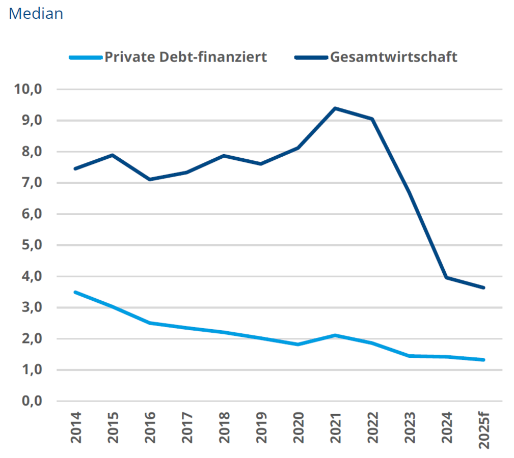 Die Zinsdeckung ist für Private Debt-Finanzierungen eine Schlüsselgröße. Sie übersetzt Kapitalstruktur und Ergebnisqualität in Schuldendienstfähigkeit. Der Monitor zeigt, dass die EBITDA Interest Coverage im Private Debt-Segment deutlich unter dem Niveau der Gesamtwirtschaft liegt. Das bedeutet: Schon moderate Ergebnisrückgänge können die Tragfähigkeit beeinträchtigen, wenn die Finanzierungskosten hoch bleiben oder weiter steigen.