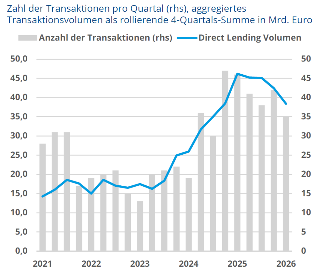 Abb. 05: Direct Lending in Europa am aktuellen Rand; Private Debt wechselt in selektionsgetriebene Marktphase [Quelle: Creditreform Rating (2026): Private Debt Monitor, Trends, Risiken, Marktdynamik, Ausgabe 1 | April 2026, S. 30]