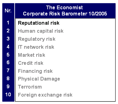 Eine gute Unternehmensreputation gilt als einer der wichtigsten immateriellen Vermögensgegenstände und ist unbestritten eine zentrale Quelle von Wettbewerbsvorteilen. Aufbau bzw. Weiterentwicklung der Unternehmensreputation bedürfen systematischer Anstrengungen über einen langen Zeitraum [Vgl. Fombrun 2000]. Umgekehrt jedoch kann die Reputation in Windeseile beschädigt oder gar gänzlich zerstört werden, wie es einige prominente Fälle der jüngeren Vergangenheit (beispielsweise Arthur Andersen, Enron) eindrücklich belegt haben. Und dies mit steigender Tendenz: Denn globale Kommunikationskanäle, ständige Medienpräsenz und schwindende Kundenloyalität wirken als Verstärker, wenn die Reputation eines Unternehmens erst einmal beschädigt wurde. So überrascht es denn auch nicht, dass aus Sicht von Corporate Risk Managern Reputationsrisiken zunehmend an Aufmerksamkeit gewinnen und etwa beim „Corporate Risk Barometer“ des Economist inzwischen den ersten Platz belegen (vgl. Abb. 01) [Economist 2006; ähnliche Ergebnisse finden sich auch AON 2006; AON 2005; NYSE 2006].