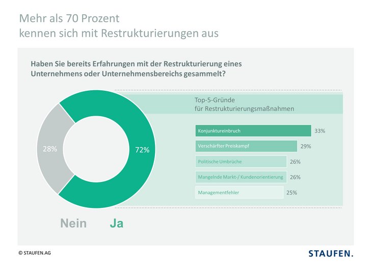 Die Wirtschaft muss sich auf solche Umbrüche einstellen, was den meisten Unternehmenslenkern klar ist. Denn ein Boom verhindert keine wirtschaftlichen Schieflagen, er macht sie nur seltener. Die meisten Gesellschafter, Vorstände und Geschäftsführer von mittelständischen Industrieunternehmen haben eigene Erfahrungen damit: Mehr als 70 Prozent mussten bereits einmal ein Unternehmen oder einen Unternehmensbereich auf neue Beine stellen. Dies ist eines der Ergebnisse der aktuellen Studie "Restrukturierung 2018" der Unternehmensberatung Staufen, für die 244 Vorstände und Geschäftsführer befragt wurden.