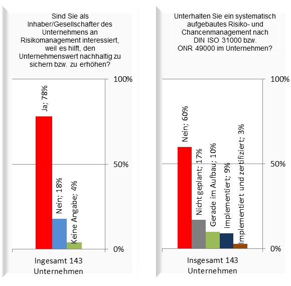 Ein gewissermaßen passiver Erkenntnischarakter lässt sich in der Gegenüberstellung der Fragen nach dem Interesse an Risikomanagement und der Umsetzung eines systematisch aufgebauten Risiko- und Chancenmanagements ableiten. So bekundet die Mehrheit (78 Prozent) Interesse am Thema und darüber hinaus auch ein Verständnis in Bezug auf die Kausalität zwischen einem gelebten Risikomanagement und der nachhaltigen Sicherung des Unternehmenswertes. Interessanterweise – jedoch ebenso inkongruent – verhält sich die mehrheitliche Verneinung (60 Prozent) auf die Frage der Implementierung eines entsprechenden Systems, etwas basierend auf dem internationalen Risikomanagement-Standard ISO 31000:2009.