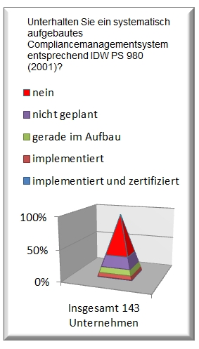 Entsprechend plausibel erscheint die dezente Handlungsbereitschaft das Thema aktiv und bewusst durch ein systematisch aufgebautes Compliancemanagementsystem in das eigene Unternehmen zu integrieren (1 Prozent). Überwiegend wird eine Einführung eines derartigen Systems verneint (63 Prozent), während im Weiteren 25 Unternehmer keinen Aufbau planen. Lediglich 13 Wirtschaftsakteure befassen sich zum Zeitpunkt der Datenerhebung mit dem Thema.