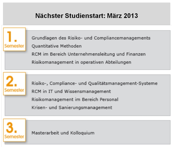 Der Weiterbildungs-Masterstudiengang soll berufserfahrene Hochschulabsolventinnen und -absolventen, vermitteln, wie Risikomanagement- und Compliancemanagementkompetenzen erlangt werden können. Dieser Studiengang konzentriert sich auf die Gebiete des Risiko- und Compliancemanagements, mit denen nahezu jedes Unternehmen inklusive Mitarbeiterinnen und Mitarbeiter in den unterschiedlichen Abteilungen und Branchen konfrontiert werden. Die Teilnehmerinnen und Teilnehmer lernen dabei auch, ihren Verantwortungsbereich zukünftig risiko- und chancenorientiert zu steuern. Im Rahmen Compliancemanagement erfolgt eine Sensibilisierung für die vielzähligen Vorgaben, Regelungen und Normen, die Mitarbeiterinnen und Mitarbeiter sowie Unternehmen zu kennen, zu beachten und deren Befolgung sie zu dokumentieren haben. Durch einen ganzheitlichen Ansatz wird gewährleistet, Probleme nicht nur aus einer fachspezifischen Sicht anzugehen, sondern den Gesamtnutzen für das Unternehmen zu optimieren und gleichzeitig bestandsbedrohende Gefahren abzuwehren. Dieses Studium soll die Absolventinnen und Absolventen für eine Position als Führungskraft qualifizieren.