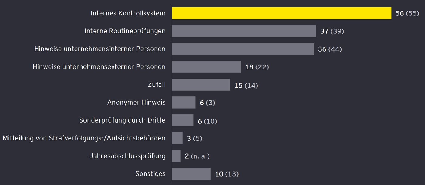 Abb. 03: Wie wurden die kriminellen Handlungen aufgedeckt? [Angaben in Prozent; Basis: Unternehmen, die bereits geschädigt wurden; Mehrfachnennungen möglich, Quelle: EY]