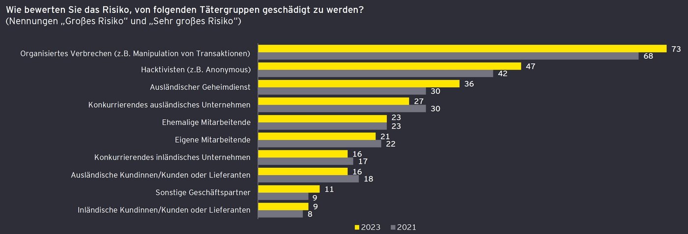 Abb. 01: Besonders gefürchtet: organisierte Kriminalität, Hackergruppen und ausländische Geheimdienste [Angaben in Prozent; Mehrfachnennungen möglich, Quelle: EY]