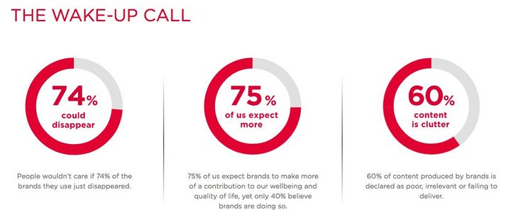 Studie Meaningful Brands, Havas Group, 2017: 74 Prozent aller Marken und 60 Prozent des produzierten Brand Contents sind nicht relevant. Weltweit wurde die Studie in 33 Ländern durchgeführt und es wurden insgesamt 300.000 Menschen in 15 Branchen zu 1.500 Marken befragt. In Deutschland wurden 50.000 Interviews geführt und 124 Marken in 11 Branchen untersucht und bewertet.