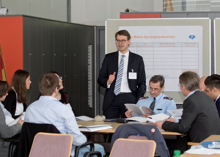 Oberstleutnant i.G. Marcel de Beus vom Kommando Heer zeigte wie ein M&A-Projekt im militärischen Bereich aussehen kann. In seinem Vortrag "Herausforderungen bei der deutsch-niederländischen Heeresintegration" wurde deutlich, wie entscheidend die Kommunikation zwischen den verschiedenen Parteien eines Mergers ist und welche Rolle insbesondere die Kultur spielen kann.