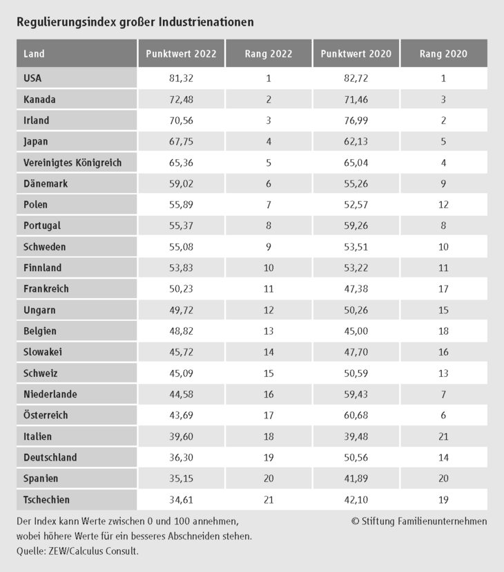 Deutschland rutscht im Vergleich der Industrienationen beim Thema Regulierung weiter ab: von Rang 14 auf Rang 19 von 21. Nur Spanien und Tschechien schneiden noch schlechter ab. Auf den Spitzenplätzen liegen die USA, Kanada, Irland und Japan.