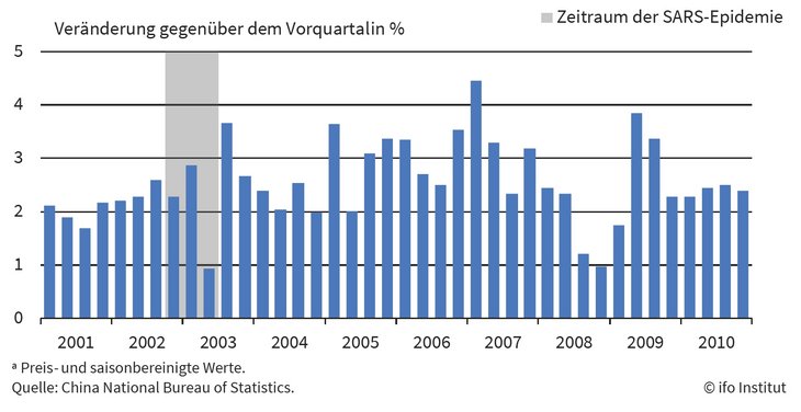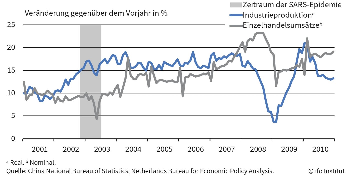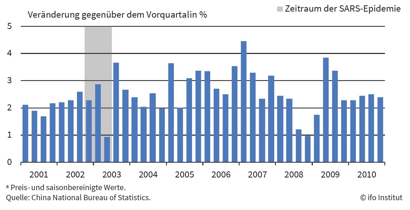 Eine derart schwache Rate wurde in China danach nur noch einmal während der Weltfinanzkrise gemessen, als im vierten Quartal 2008 die Wachstumsrate auf ein Prozent sank. Im Gegensatz zur Weltfinanzkrise, deren konjunkturelle Folgen über mehrere Quartale zu spüren waren, erholte sich das Wachstum bei der SARS-Epidemie allerdings recht zügig. Die ifo-Analyse zeigt auf, dass bereits im dritten Quartal sich der Anstieg des chinesischen Bruttoinlandsprodukts wieder auf 3,7 Prozent beschleunigte. Damit waren die negativen Auswirkungen auf die chinesische Konjunktur nur von sehr kurzfristiger Natur. Für das Gesamtjahr 2003 kommen Simulationsrechnungen zu dem Ergebnis, dass die SARS-Epidemie die Wachstumsrate um etwa ein Prozentpunkt gedämpft haben dürfte.