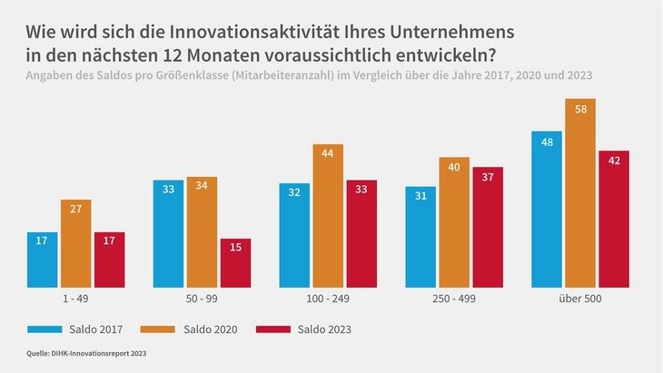 Die derzeitigen Rahmenbedingungen in Deutschland hemmen die überwiegende Mehrzahl der Unternehmen bei ihren Innovationsaktivitäten. Betroffen sind kleine und große Unternehmen gleichermaßen. Die Folge: Obwohl insgesamt weiterhin mehr Betriebe ihr Innovationsengagement steigern als reduzieren wollen, ist der Innovationsaktivitätssaldo größenunabhängig seit 2020 deutlich gesunken: für Unternehmen mit einer Größe von über 500 Mitarbeitern um 16 Punkte (von 58 auf 42), bei Unternehmen bis zu 500 Mitarbeitern um 3 Punkte (von 40 auf 37), und bei den kleinsten Betrieben um 10 Punkte (von 27 auf 17). Die stärkste Reduzierung von Aktivitäten fand bei Unternehmen mit einer Größe von 50 bis 99 Mitarbeitern statt: Ein Rückgang um 19 Punkte (von 34 auf 15). Es zeigt sich – das Zurückfahren von Investitionen kommt zum Schluss auch bei den Innovationen an.