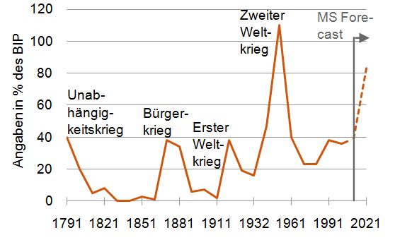 Abbildung: Staatsschulden in % des Bruttoinlandsprodukts in den USA [Quelle: Morgan Stanley]