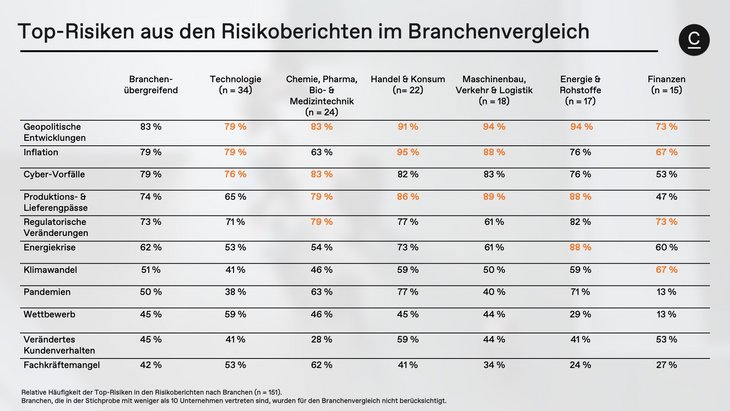 Energie, Handel und Maschinenbau weisen im Branchenvergleich die höchste Risikosensibilität auf. Für die drei Branchen stellen geopolitische Entwicklungen (> 90 Prozent), Lieferengpässe (> 80 Prozent) und die Inflation (> 75 Prozent) die Top-Risiken im Risikobericht dar. Unternehmen aus der Finanzbranche greifen in ihren Risikoberichten hingegen die wenigsten Risiken auf.