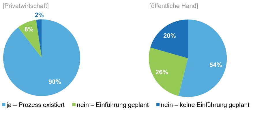 In Bezug auf die Existenz eines formalisierten Risikomanagementprozesses wurde generell eine große Verbreitung festgestellt. In der Privatwirtschaft besteht bei 90 Prozent der Studienteilnehmenden bereits ein formalisierter Risikomanagementprozess und bei weiteren acht Prozent ist die Einführung geplant. Bei der öffentlichen Hand hat Risikomanagement in den letzten Jahren an Bedeutung gewonnen und formalisierte Risikomanagementprozesse wurden bei mehr als der Hälfte der analysierten Organisationen vorgefunden. Weitere 26 Prozent der öffentlichen Institutionen planen die Einführung, obwohl in der Schweiz noch kaum gesetzliche Rahmenbedingungen für ein Risikomanagement im öffentlichen Sektor bestehen.