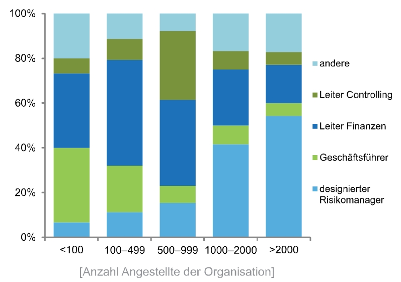 Je nach Organisationsgrösse variiert dabei die Verantwortlichkeit für das Risikomanagement. Bei kleineren Organisationen liegt die Verantwortung der Durchführung direkt beim Vorstandsvorsitzenden oder Geschäftsführer bzw. beim Finanzvorstand. Grössere Organisationen haben nicht selten die Funktion eines Risikomanagers bzw. Chief Risk Officers eingeführt. Dieser kann in der Regel eine neutralere und unabhängigere Position einnehmen. Die Kategorie der Organisationen mit 500 bis 999 Mitarbeitenden stellt einen Sonderfall dar. Der Nutzen von Risikomanagement wird bei diesen Organisationen tiefer eingeschätzt und in keiner anderen Kategorie verantworten primär Controller das Risikomanagement. Das Risikomanagement fällt somit zwischen oberste Ebene (CEO, CFO) und Spezialist (designierter Risikomanager) und erhält nicht genügend Aufmerksamkeit des Managements. Insbesondere hier ist Handlungsbedarf gefragt, um das Potenzial von Risikomanagement durch einen effizienten Prozess ausschöpfen zu können.