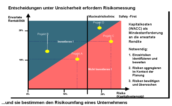 Risikomanagement ist nicht primär eine Organisationseinheit, sondern umfasst alle Funktionen und Kompetenzen im Unternehmen, die sich mit der unsicheren Zukunft und den daraus resultierenden Risiken befassen. Mit Hilfe von Risikomanagement-Funktionen wird die Unternehmensleitung in die Lage versetzt, bei ihren wesentlichen Entscheidungen (etwa bei Investitionen) die dort zu erwartenden Erträge und die damit verbundenen Gefahren (Risiken) gegeneinander abzuwägen (siehe Abbildung).
