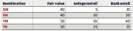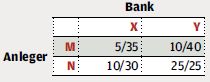 Die Zahlen in Tabelle 1 sind fiktiver Natur. Sie können von beiden Spielern beobachtet werden. Die Spielmatrix in Tabelle 2 enthält die Zahlen über die Anteile aus Tabelle 1. Jedes Feld der Matrix steht für genau eine Strategie-Kombination. In jedem Feld findet man zwei Zahlen. Die erste Zahl gilt für den Zeilenspieler «Anleger», die zweite für den Spaltenspieler "Bank". Welche Kombination aus Tabelle 2 ist das Nash-Gleichgewicht? Das Nash-Gleichgewicht ist definitionsgemäss jene Kombination, von der kein Spieler abweicht, wenn der Gegenspieler daran festhält. Im Beispiel ist das die Kombination XN. Weder Bank noch Anleger werden abweichen. Bei allen anderen Kombinationen treten Abweichungen auf. Die Bank wird bei XN das X-Produkt anbieten, obwohl der Fair Value kleiner ist als beim Y-Produkt. Im Stochastik-Ansatz hätte die Bank das Y-Produkt mit dem hohen Fair Value gewählt. Die Fehlentscheidung ist darauf zurückzuführen, dass eine "falsche Welt" unterstellt wurde. Bei Informationseffizienz herrschen marktuntypische Laborbedingungen.