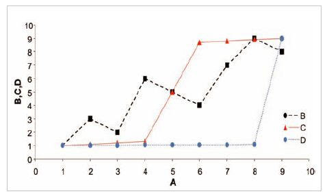 Betrachten wir einmal den Zusammenhang zwischen den Variablen B, C und D und der Variablen A. Nehmen wir dabei an, dass es uns nur darum geht festzustellen, ob mit wachsenden Werten von A auch die Werte der anderen Variablen steigen. In vielen Untersuchungen findet man dazu die Berechnung des „normalen“ Korrelationskoeffizienten, der auf Pearson zurückgeht. Im Beispiel erhält man für den Zusammenhang zwischen A und B den Wert 0,9, für A und C 0,9243 und für A und D 0,5549. Die Interpretation wäre damit, dass die Größen B und C zwar nicht perfekt, aber doch sehr hoch positiv mit A korreliert sind, d. h. bei diesen Variablen mit größeren Werten von A die Werte für B und C tendenziell auch größer sind. Für den Zusammenhang zwischen A und D gilt das in deutlich schwächerer Weise.