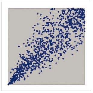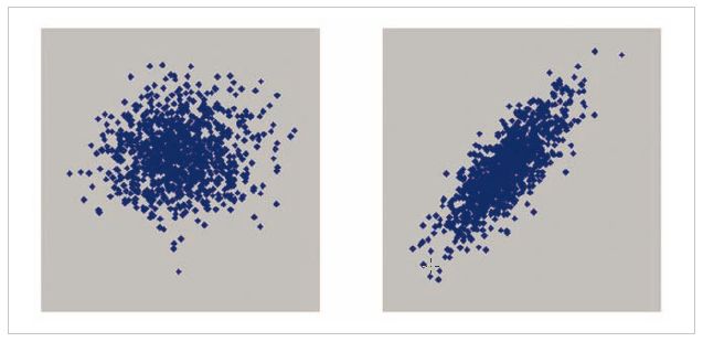 Dieses ist nicht die geeignete Stelle, um auf mathematische Hintergründe und Details einzugehen. Stattdessen mögen zwei Abbildungen genügen, um den wichtigen Punkt deutlich zu machen. Dazu stelle man sich vor, dass die Renditen zweier Finanztitel (oder auch Marksegmente) in vielen Situationen ermittelt und jeweils als Punkte in einem Diagramm eingetragen werden (vgl. Abb. 2). Ein einzelner Punkt gibt also auf der waagerechten Achse die Rendite des ersten und auf der senkrechten Achse die des zweiten Finanztitels an. Je weiter rechts bzw. weiter oben die Punkte liegen, desto höher ist folglich die Rendite des ersten bzw. zweiten Finanztitels.