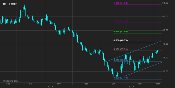 Brent crude has now breached resistance at $37.40/b, which is the first retracement level of the October to January selloff. A clear break above would open the path for an extension towards $40/b while the uptrend will only be challenged on a break back below $33/b.