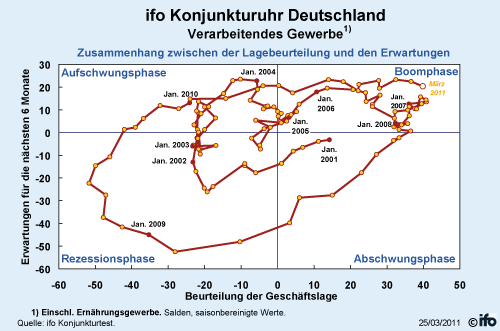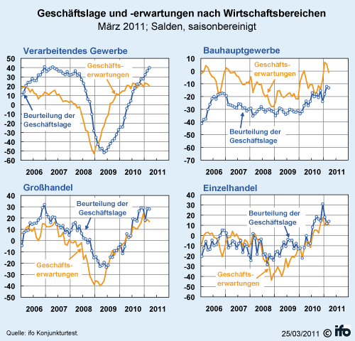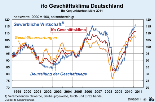 Das Geschäftsklima der gewerblichen Wirtschaft Deutschlands hat sich im März entgegen den Erwartungen nur geringfügig eingetrübt. Volkswirte zeigten sich beeindruckt, dass sich das Klima trotz der Katastrophe in Japan, steigender Energiepreise und der Erwartung steigender Zinsen so stabil gezeigt hat. ifo-Präsident Hans-Werner Sinn sagte, die "Konjunkturampeln" stünden unverändert auf grün. "Deutschland befindet sich im Aufschwung."