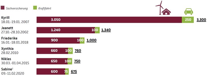 "Sabine" reiht sich damit auf Platz sechs der schwersten Winterstürme in Deutschland seit 2002 ein. Unverändert führt die Liste "Kyrill" (2007) mit mehr als drei Milliarden Euro versicherten Schäden vor "Jeanette" (2002) mit 1,3 Milliarden Euro und "Friederike" (2018) mit einer Milliarde Euro an.