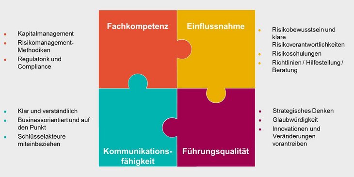 - Fachkompetenz: Risikomanager benötigen ein profundes Verständnis von allen Bereichen in der Wertschöpfungskette eines Versicherers; darüber hinaus müssen sie Risikomanagement-Methodiken von der Risikoidentifikation über die -bewertung, -steuerung und -überwachung beherrschen.