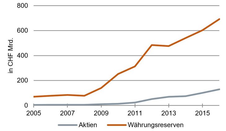 Das prominenteste Beispiel in dieser Beziehung ist zweifellos die Schweiz. Ihre Notenbank wies Ende 2016 in ihrer Bilanz Aktienbestände von CHF 129 Mrd. aus. Zum ersten Mal hat sie im Jahr 2005 Dividendenpapiere gekauft. Damals waren es CHF 4 Mrd. (= 6 Prozent der Währungsreserven). Inzwischen beträgt der Anteil der Aktien an den Währungsreserven fast 20 Prozent (siehe Grafik). Die Notenbank in Bern hat heute Aktien von Unternehmen rund um die Welt, einschließlich der Schwellenländer. Nur in der Schweiz selbst ist sie nicht investiert.