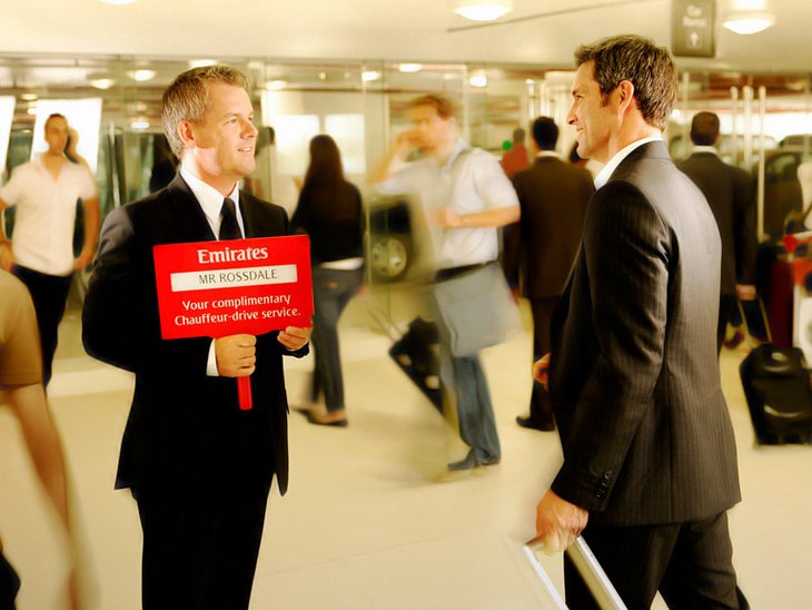 Service mit klarem Kundennutzen von EMIRATES: "Wir bieten unseren First Class- und Business Class-Passagieren in mehr als 55 Städten einen kostenlosen Chauffeur-Service für den Transport vom und zum Flughafen an. Transfers sind für folgende Routen verfügbar: Von Ihrer Privatadresse oder vom Hotel zum Flughafen, vom Flughafen zu Ihrem Endziel und vom Flughafen und zurück bei Zwischenstopps". [Quelle: Emirates]