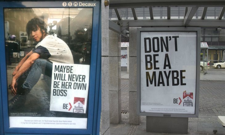 Selbst die sonst in der selbstähnlichen Markenführung so konsequente Marke Marlboro verließ in seiner von Leo Burnett (Frankfurt) gestalteten Kampagne "May be will never be her own Boss. Be Marlboro" sein angestammtes Kommunikationsmuster "Cowboy, Pferde, Monument Valley", um angeblich den Wunsch nach Freiheit und Abenteuer für die größer werdende Zielgruppe der Frauen zu unterstützen. Zu guter Letzt musste Philip Morris die Kampagne in Deutschland sogar stoppen, weil die meisten Bundesländer, aber auch das Bundesverbraucherschutzministerium (BMELV), darin einen Verstoß gegen den §22 des "Vorläufigen Tabakgesetzes" sahen.
