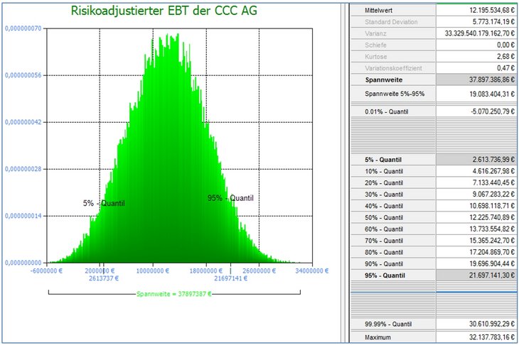 Die Spalte "risikoadjustierte Planung" in Abb. 04 zeigt ein potenzielles Szenario der um die Risiken und Chancen adjustierten Planwerte der CCC AG und ihre Auswirkung auf die primäre Zielgröße EBT.