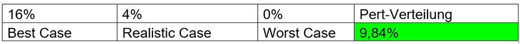Risiko/Chance 01 bis Risiko/Chance 04 fasst die Bewertung der bekannten Risiken zusammen. Die im Realistic Case angenommenen Werte entsprechen prozentual den monetären Werten, die im Rahmen der klassischen Risikoquantifizierung bereits angenommen beziehungsweise durch Fachexperten geschätzt wurden. Für Risiko 1 wurde eine Dreiecksverteilung der Inputwerte angenommen, da diese aufgrund ihres linearen Verlaufs typisch für eine zukünftige Verkaufs- beziehungsweise Umsatzentwicklung ist. Für Risiko 2 und Chance 4 wurde eine Pert-Verteilung angenommen, da angenommen wird, dass die Worst und Best Case Werte, anders als in der Dreiecksverteilung, im Verhältnis zum Abstand zum Realistic Case exponentiell stark fallen, die Ausprägung aber dennoch nicht symmetrisch oder gar normalverteilt ist. Risiko 3 wurde aus Ermangelung genauerer Informationen eine Normalverteilung zugrunde gelegt, die bei -1% und +1% trunkiert wird. Die dargestellten Risiken wirken auf die in Abb. 03 beschriebenen Zielgrößen. Zusammen mit den weiteren Positionen aus der Planungsrechnung wird nunmehr eine risikoadjustierte Planung erstellt.