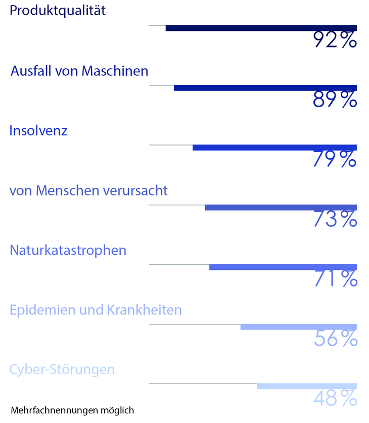 99 Prozent der befragten Unternehmen gaben dabei an, in den vergangenen fünf Jahren eine Störung in ihrer Lieferkette erlebt zu haben. Mit 73 Prozent schätzen Unternehmen der Automobilindustrie Störungen in der Lieferkette als deutlich größeres Problem ein als andere Branchen. Die häufigsten Ursachen sind dabei mangelnde Produktqualität, Ausfall von Maschinen- und Steuerungssystemen sowie Insolvenz. Nur 28 Prozent der beschriebenen Störungen in der Lieferkette haben dabei ihren Ursprung beim befragten Unternehmen selbst.