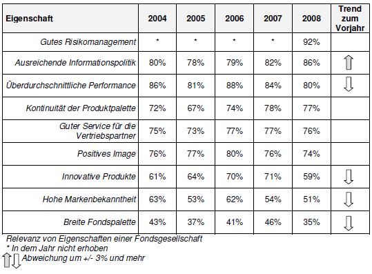 Die Finanzkrise hat bei den unterschiedlichen Käufern von Investmentfonds zu einer Verschiebung der Erwartungen an Fondsgesellschaften geführt. Das zeigt eine im Auftrag der Investmentgesellschaften BlackRock, Fidelity, Franklin Templeton Investments, Invesco, J.P. Morgan Asset Management, Robeco und Threadneedle durchgeführten Studie, die seit 2004 jährlich die Einstellungen der verschiedenen Vertriebspartner von Investmentgesellschaften misst. So waren 2008 für 92 Prozent der Befragten ein gutes Risikomanagement und eine ausreichende Informationspolitik die wichtigsten Kriterien bei der Anlageentscheidung. Erst danach folgte eine überdurchschnittliche Performance mit einer Relevanz von 80 Prozent. 2007 war die Performance mit 84 Prozent noch das wichtigste Auswahlkriterium. Die Kontinuität in der Produktpalette (77 Prozent), ein guter Service für die Vertriebspartner (76 Prozent) und ein positives Image (74 Prozent) der Investmentgesellschaften waren im Vergleich zum Vorjahr nahezu unverändert wichtig.