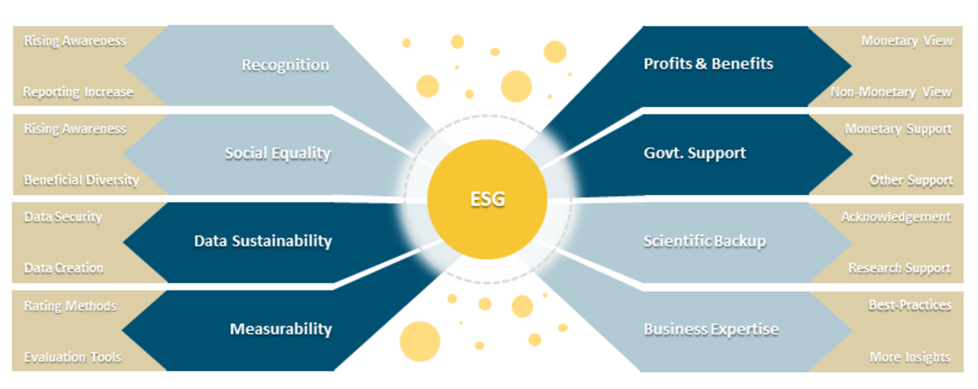 The factors were separated into two categories and four subcategories, to provide an improved overview. The dark blue topics deal with technical-based aspects of the ESG ecosystem, while the light blue ones deal with content-based aspects. The upper left two represent more socially motivated content, whereas the bottom right deal more with knowledge-related arguments. The bottom left two cope more with data-driven aspects, while the upper right directly emphasize monetary arguments. Additional yellow circles are displayed for the reason of underlining further matters within the sustainability environment, i. e. that there are criteria other than ESG.