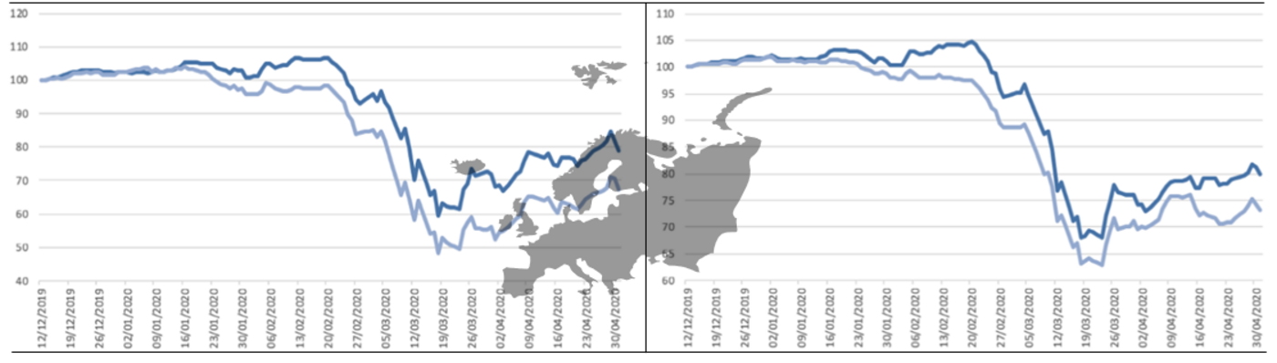 As a recent example, different case studies regarding business performances during the COVID-19 pandemic underline the resilience of ESG-oriented corporations (Examples: medium.com/@sensefolio/case-study-top-esg-company-performance-during-a-pandemic-example-of-covid-19-e57d84e3b066, www.cnbc.com/2020/06/07/sustainable-investing-is-set-to-surge-in-the-wake-of-the-coronavirus-pandemic.html, www.funds-europe.com/news/esg-rating-linked-to-outperformance-amidst-coronavirus-pandemic). The focus on non-traditional, i. e. non-financial risks led to portfolios of companies that explain this toughness during the COVID-19 downturn. The values of a "designed for sustainability" strategy plan can therefore be broken down not just to intangible advantages, but also facts based on tangible evidence: The figure below indicates the results of a research on 2,000 largest companies (by market capitalization) of the regions USA, Europe and Asia conducted by Sense Folio. The general takeaway is that top ESG-score companies are generally outperforming bottom ESG-score companies and even more so, during a crisis like the COVID-19 pandemic (Sense Folio, 2020). The dark blue line represents Top Companies with an ESG Score > 60 and Top 2-Months∆ESG Score (Portfolio 100 Top). The light blue line represents Bottom Companies with an ESG Score < 40 and Bottom 2-Months∆ESG Score (Portfolio 100 Top).