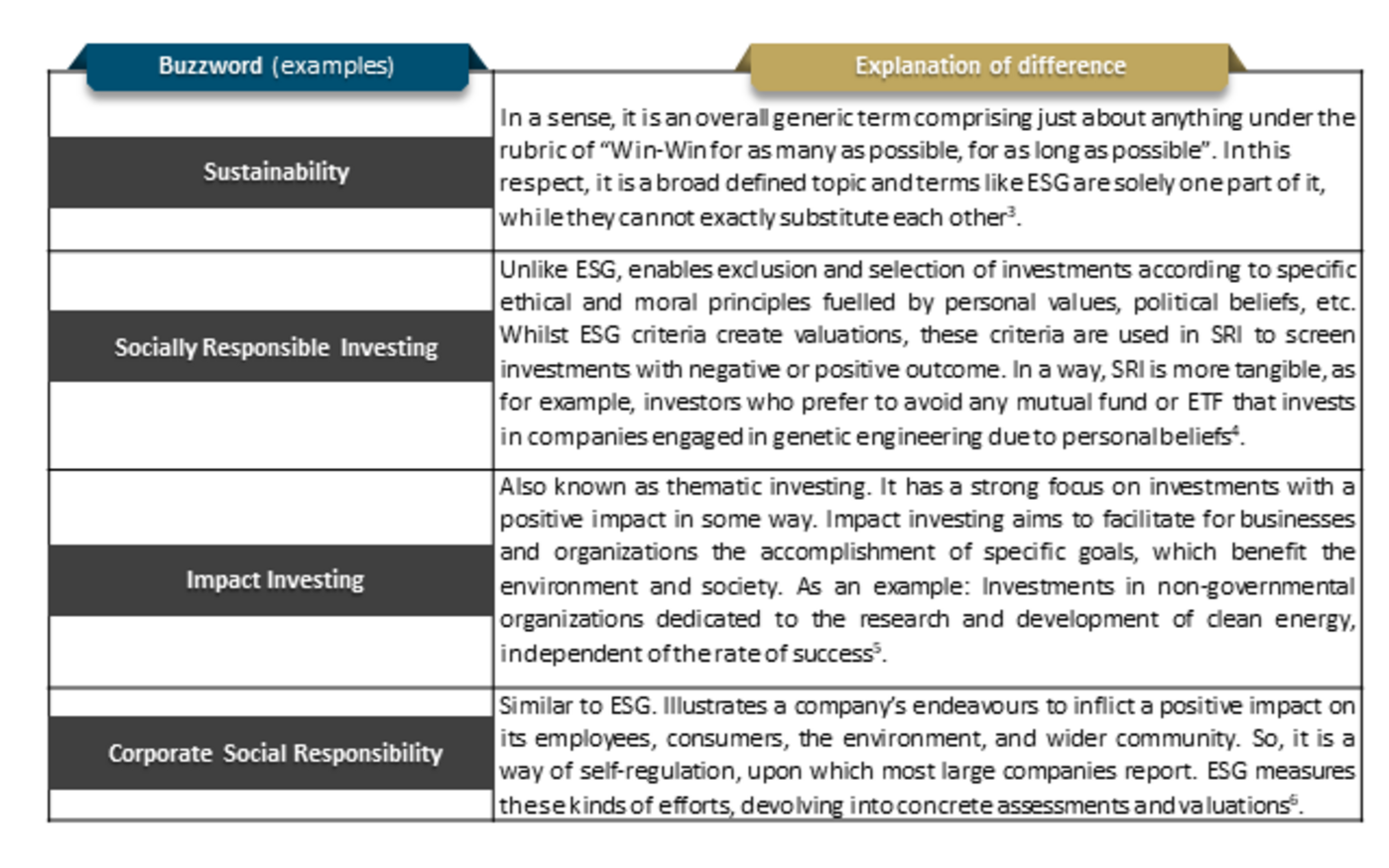 Furthermore, in the scope of addressing ESG, it is also required to list some of the buzzwords related to sustainability, which are mentioned broadly throughout the internet as well as literature itself. Consequently, the table above is listing the differences of these terms to the topic of ESG followed in connection. Here, the importance of keeping in mind that the table is far from complete and numerous more buzzwords will appear as time progresses and more data (like scientific researches), insights (like best-practices) as well as acceptance are found, is essential. Therefore, openness or rather adaptability to changing priorities and terms related to the sustainability discussions is recommended.